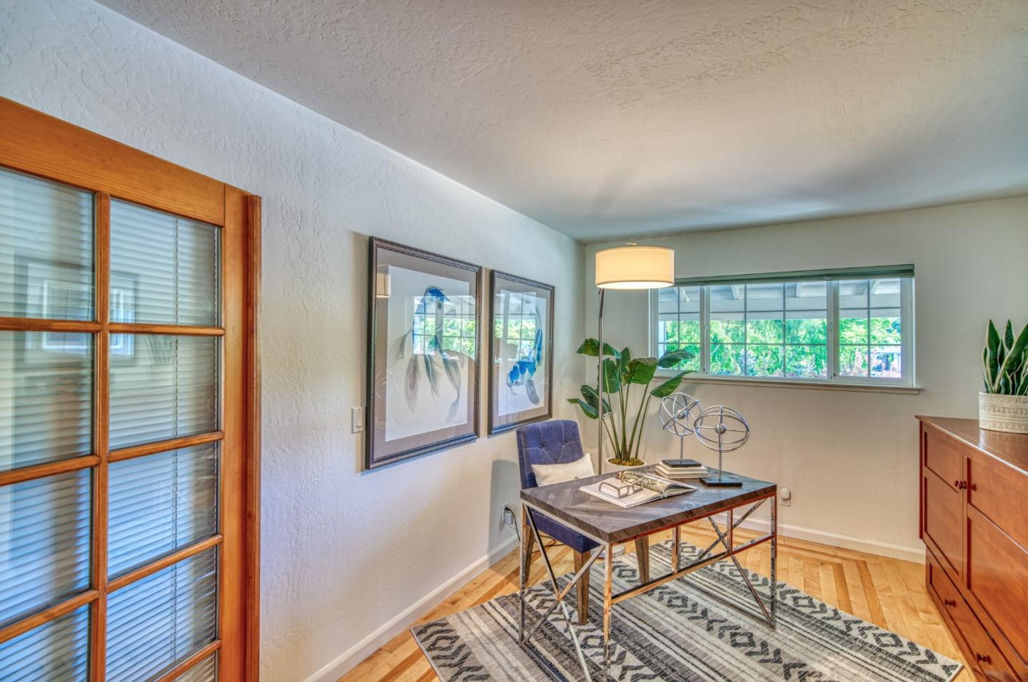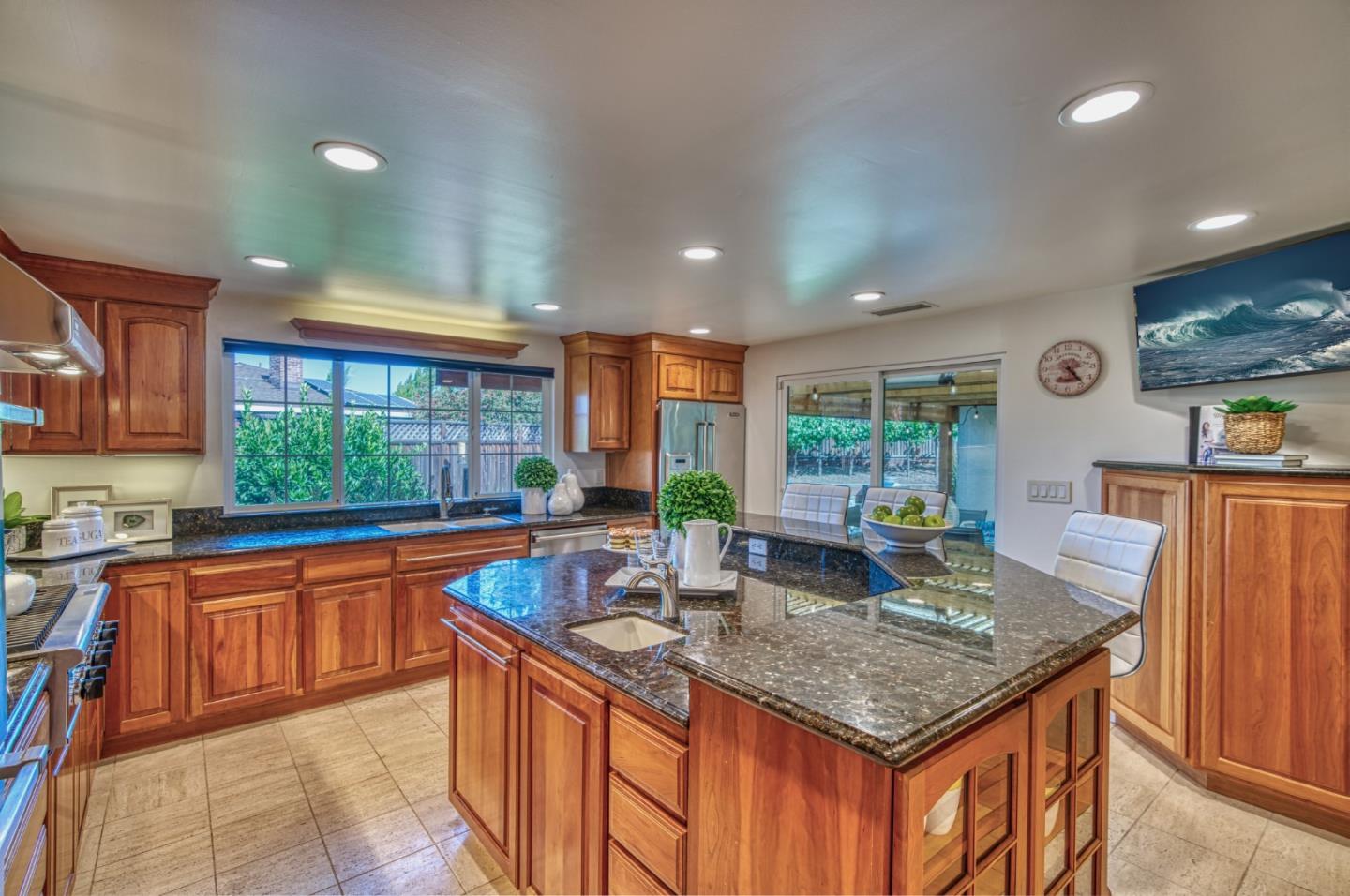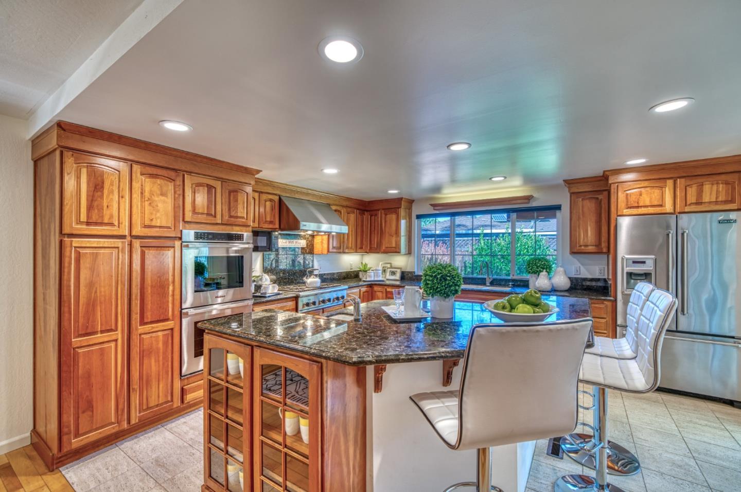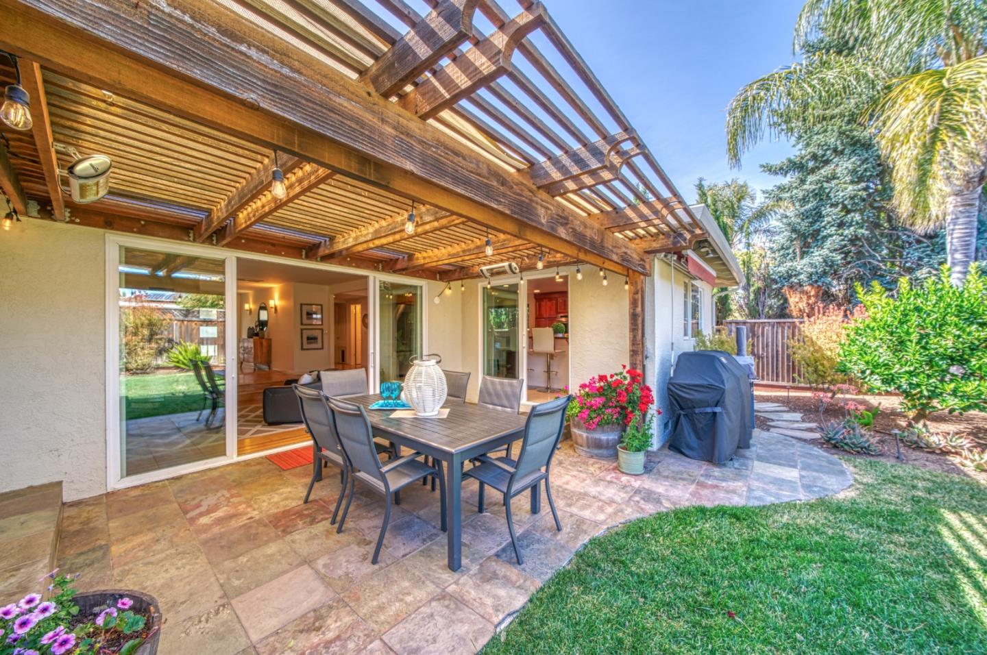 This beautiful 4 bedroom, 2.5 bathroom was designed for comfort and style! A few key features: Hardwood maple floors, in the bedrooms, living, and dining areas, with a newly installed floor in the Primary bedroom. fresh interior paint throughout. Large open living room with Travertine gas fireplace, Nest thermostat, Central Air & Heat. Separe dinine area / Butlers station with granite countertops, cherrywood cabinets, wet bar, with 180 bottle wine refrigerator. Updated chefs kitchen features all stainless steel appliances: double Dacor oven, built-in microwave / Thermador 6 burner gas stove w/ exhaust hood, Viking dishwasher, Viking Refrigerator, large center island with granite counters, extra sink. One bedroom is also perfect for home office. Remodeled Hall bathroom with large shower and double sink vanity. Primary Suite features: new maple floor, walk-in closet, combination wall safe, with access to private covered patio and patio area. Beautifully Landscaped front and back with with Large Trellis over main patio, Great for outdoor entertaining: 3 separate patio areas / gas firepit, lush greenery with lemon, olive trees, grapevines, and a raised vegetable garden. Owned Solar Panels 6.3 KW. Dual Pane Windows / Tuff Shed /