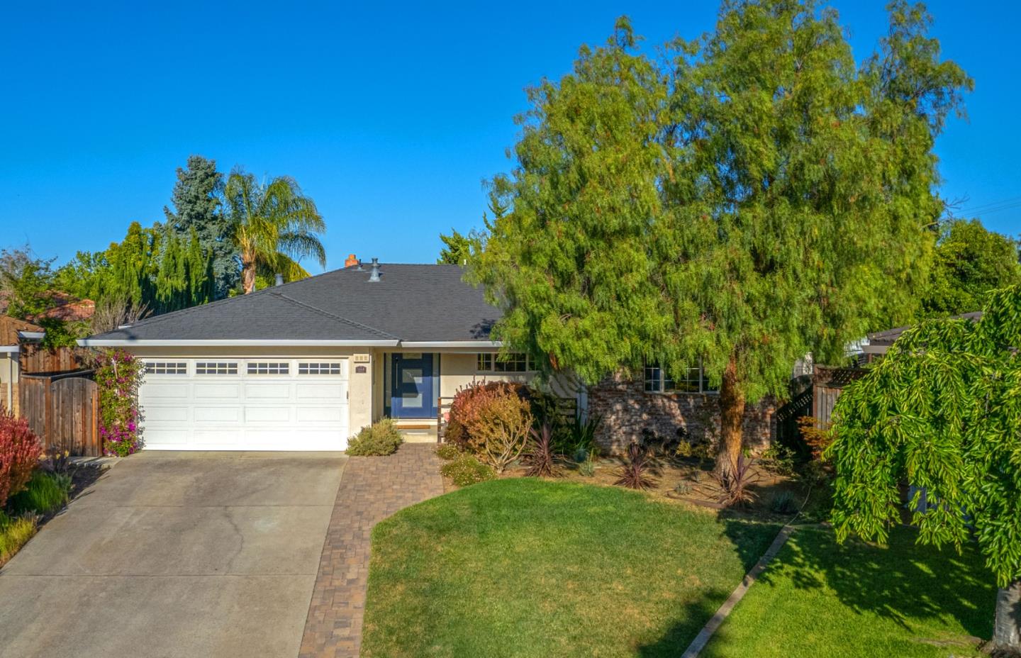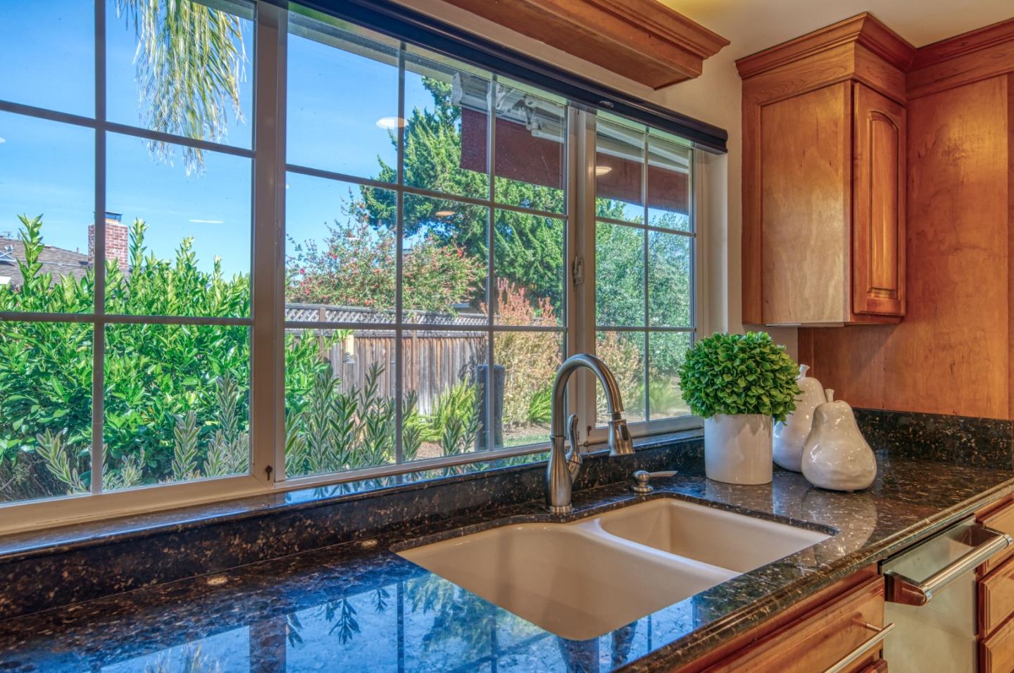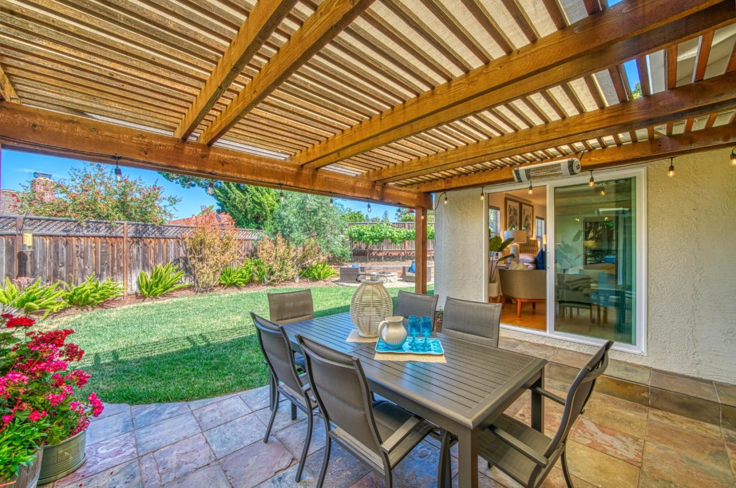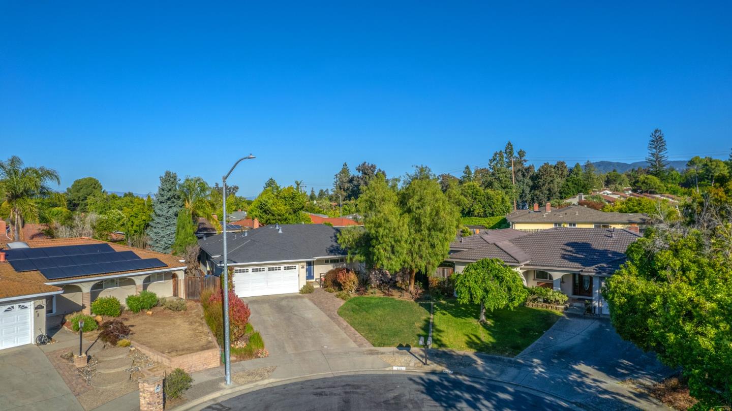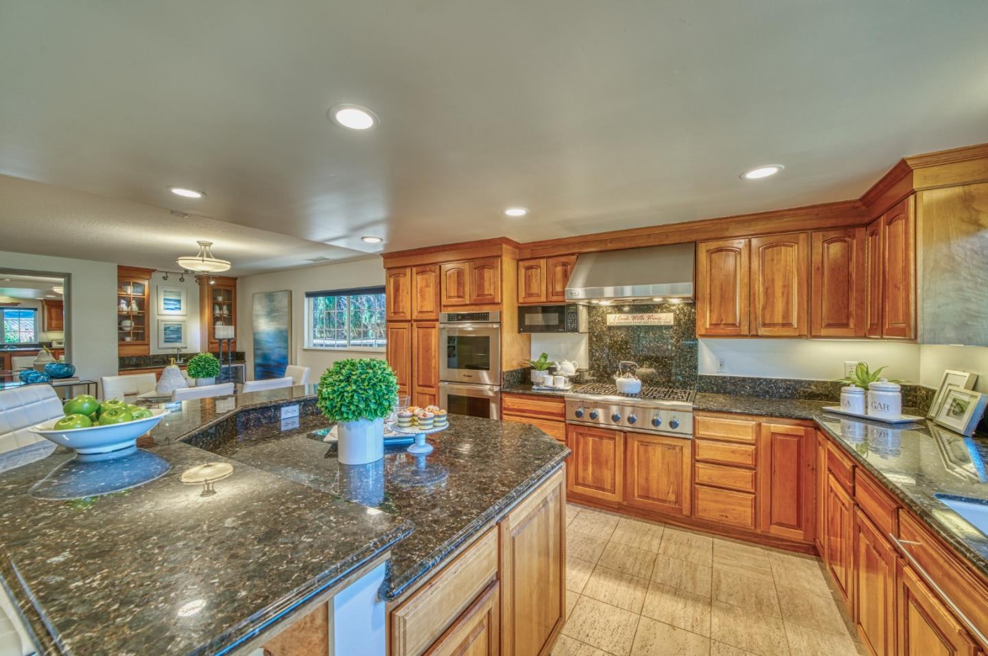 This beautiful 4 bedroom, 2.5 bathroom was designed for comfort and style! A few key features: Hardwood maple floors, in the bedrooms, living, and dining areas, with a newly installed floor in the Primary bedroom. fresh interior paint throughout. Large open living room with Travertine gas fireplace, Nest thermostat, Central Air & Heat. Separe dinine area / Butlers station with granite countertops, cherrywood cabinets, wet bar, with 180 bottle wine refrigerator. Updated chefs kitchen features all stainless steel appliances: double Dacor oven, built-in microwave / Thermador 6 burner gas stove w/ exhaust hood, Viking dishwasher, Viking Refrigerator, large center island with granite counters, extra sink. One bedroom is also perfect for home office. Remodeled Hall bathroom with large shower and double sink vanity. Primary Suite features: new maple floor, walk-in closet, combination wall safe, with access to private covered patio and patio area. Beautifully Landscaped front and back with with Large Trellis over main patio, Great for outdoor entertaining: 3 separate patio areas / gas firepit, lush greenery with lemon, olive trees, grapevines, and a raised vegetable garden. Owned Solar Panels 6.3 KW. Dual Pane Windows / Tuff Shed /