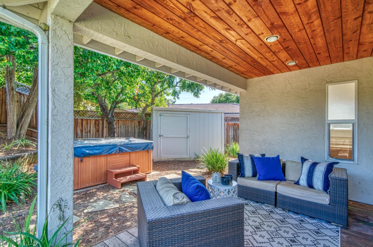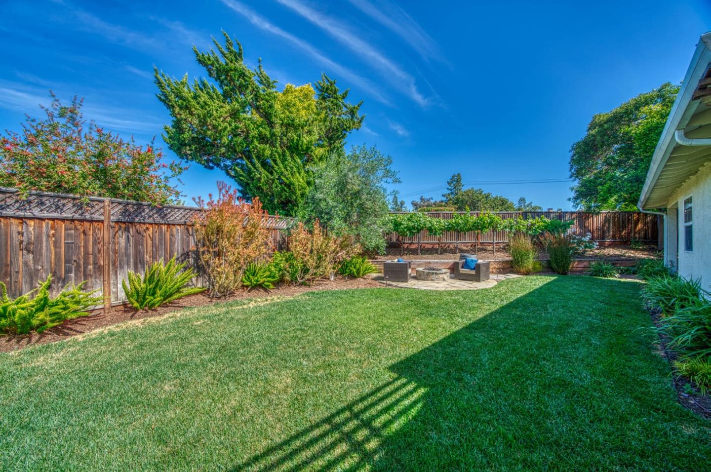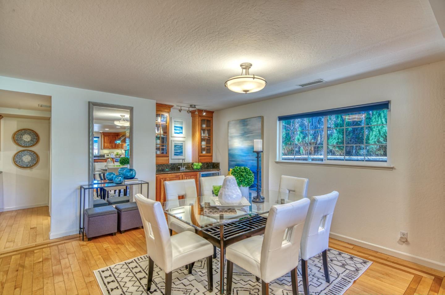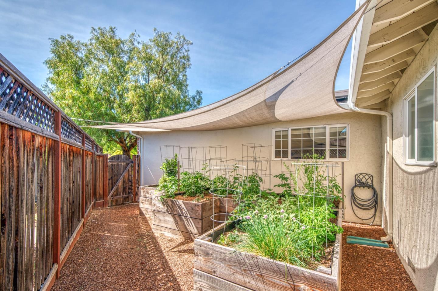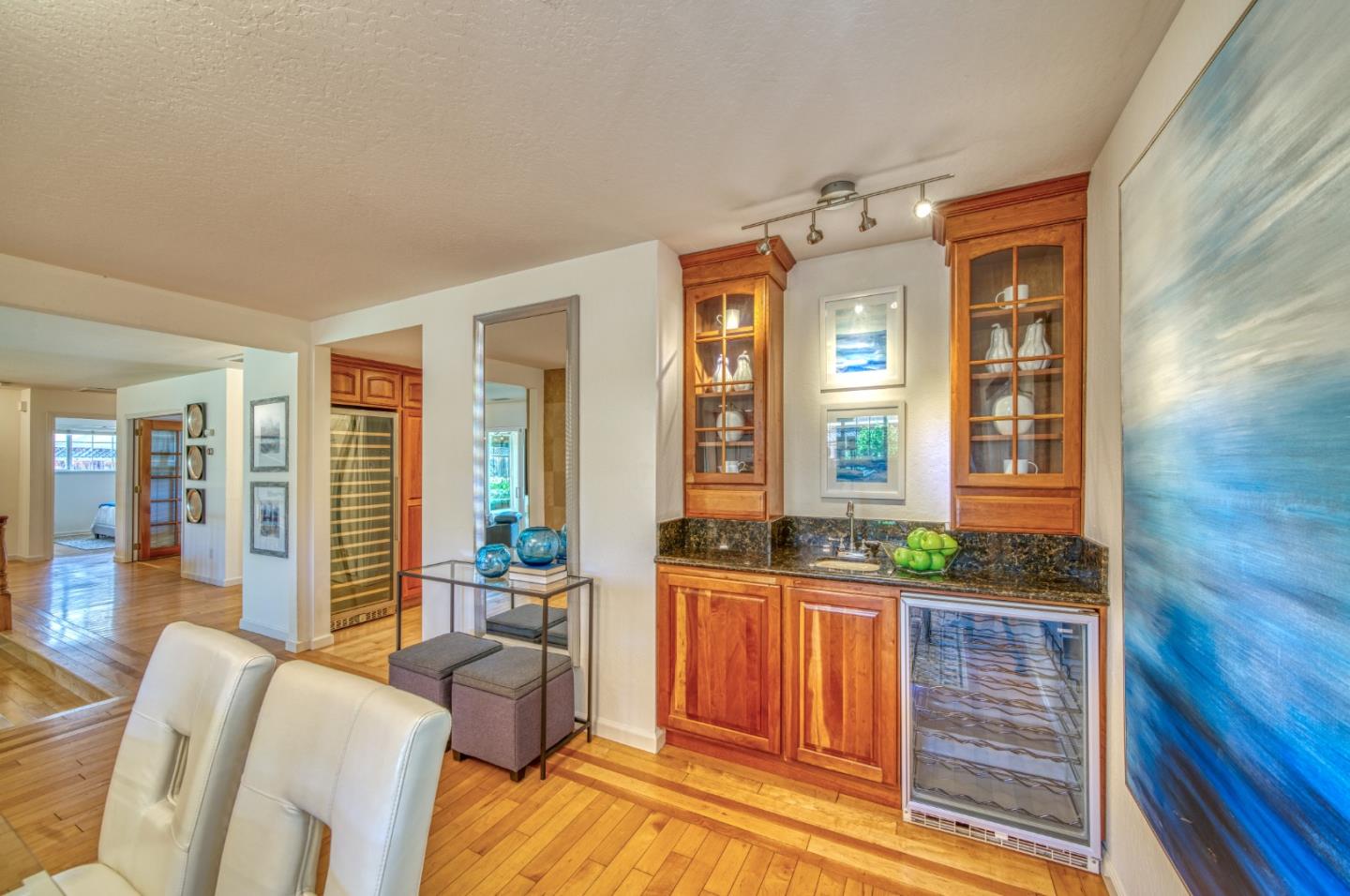 This beautiful 4 bedroom, 2.5 bathroom was designed for comfort and style! A few key features: Hardwood maple floors, in the bedrooms, living, and dining areas, with a newly installed floor in the Primary bedroom. fresh interior paint throughout. Large open living room with Travertine gas fireplace, Nest thermostat, Central Air & Heat. Separe dinine area / Butlers station with granite countertops, cherrywood cabinets, wet bar, with 180 bottle wine refrigerator. Updated chefs kitchen features all stainless steel appliances: double Dacor oven, built-in microwave / Thermador 6 burner gas stove w/ exhaust hood, Viking dishwasher, Viking Refrigerator, large center island with granite counters, extra sink. One bedroom is also perfect for home office. Remodeled Hall bathroom with large shower and double sink vanity. Primary Suite features: new maple floor, walk-in closet, combination wall safe, with access to private covered patio and patio area. Beautifully Landscaped front and back with with Large Trellis over main patio, Great for outdoor entertaining: 3 separate patio areas / gas firepit, lush greenery with lemon, olive trees, grapevines, and a raised vegetable garden. Owned Solar Panels 6.3 KW. Dual Pane Windows / Tuff Shed /