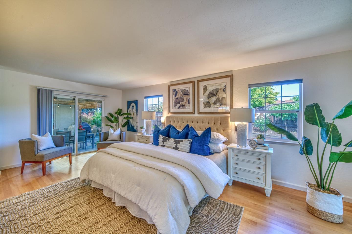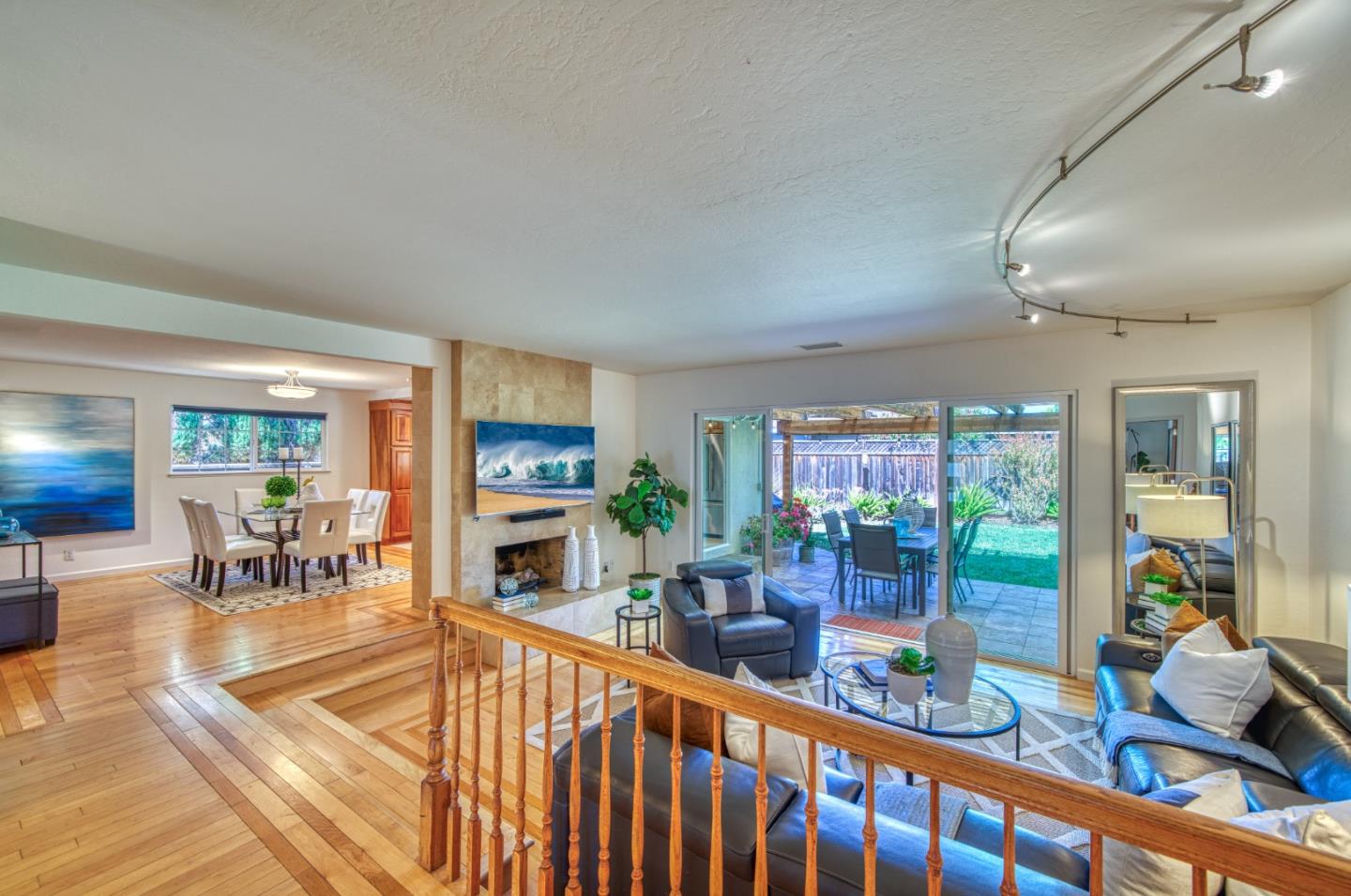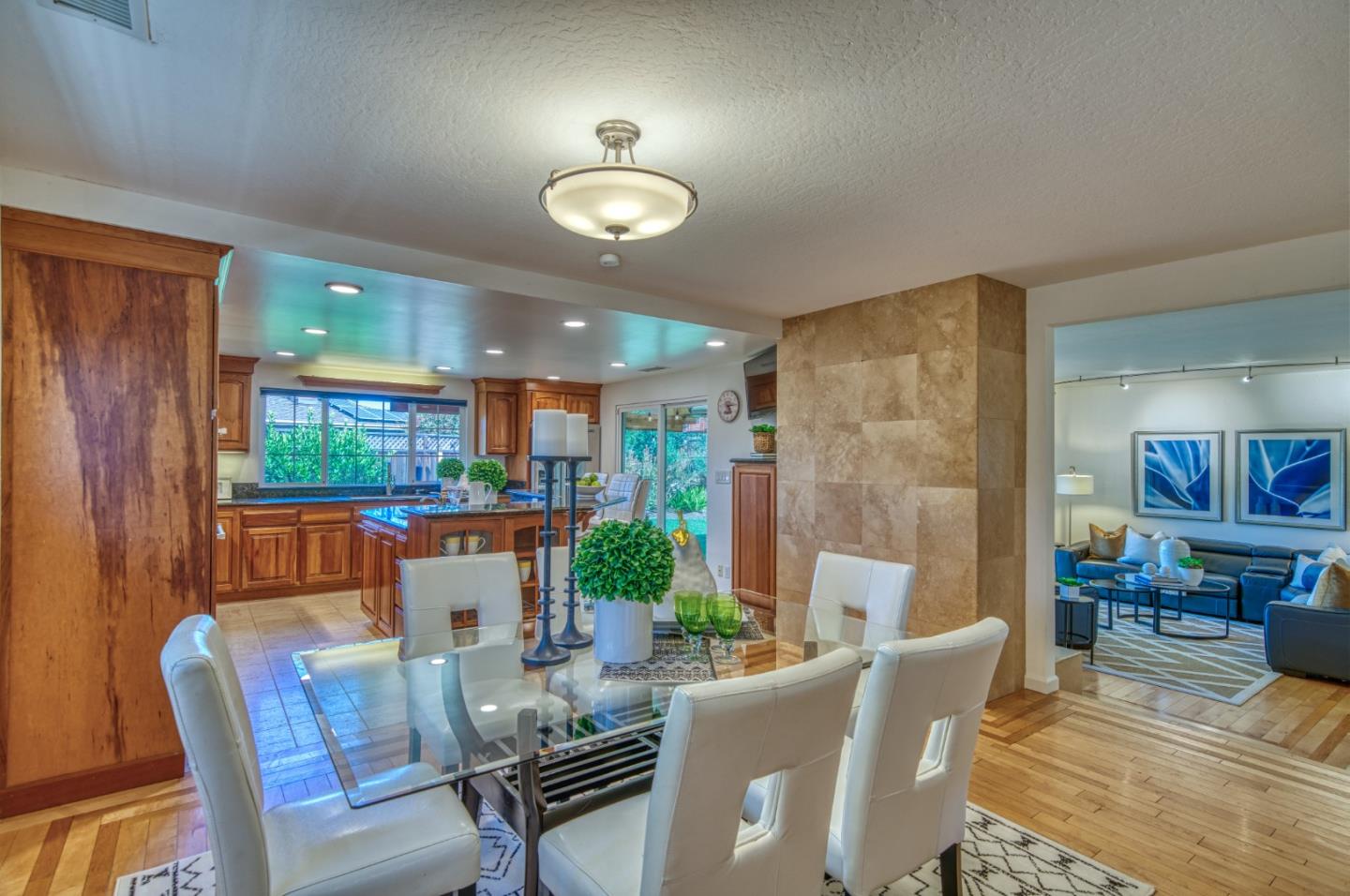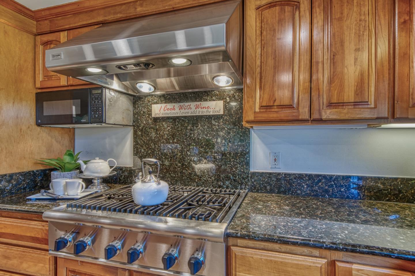 This beautiful 4 bedroom, 2.5 bathroom was designed for comfort and style! A few key features: Hardwood maple floors, in the bedrooms, living, and dining areas, with a newly installed floor in the Primary bedroom. fresh interior paint throughout. Large open living room with Travertine gas fireplace, Nest thermostat, Central Air & Heat. Separe dinine area / Butlers station with granite countertops, cherrywood cabinets, wet bar, with 180 bottle wine refrigerator. Updated chefs kitchen features all stainless steel appliances: double Dacor oven, built-in microwave / Thermador 6 burner gas stove w/ exhaust hood, Viking dishwasher, Viking Refrigerator, large center island with granite counters, extra sink. One bedroom is also perfect for home office. Remodeled Hall bathroom with large shower and double sink vanity. Primary Suite features: new maple floor, walk-in closet, combination wall safe, with access to private covered patio and patio area. Beautifully Landscaped front and back with with Large Trellis over main patio, Great for outdoor entertaining: 3 separate patio areas / gas firepit, lush greenery with lemon, olive trees, grapevines, and a raised vegetable garden. Owned Solar Panels 6.3 KW. Dual Pane Windows / Tuff Shed /