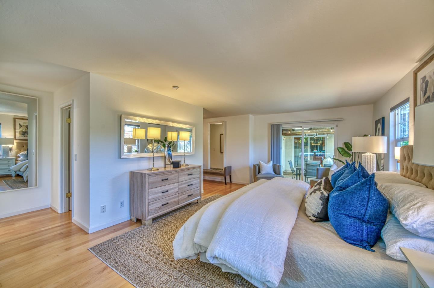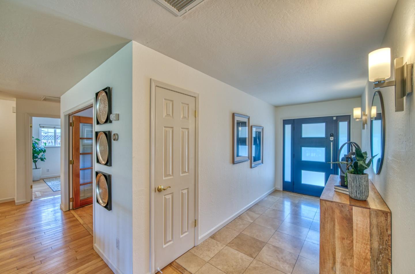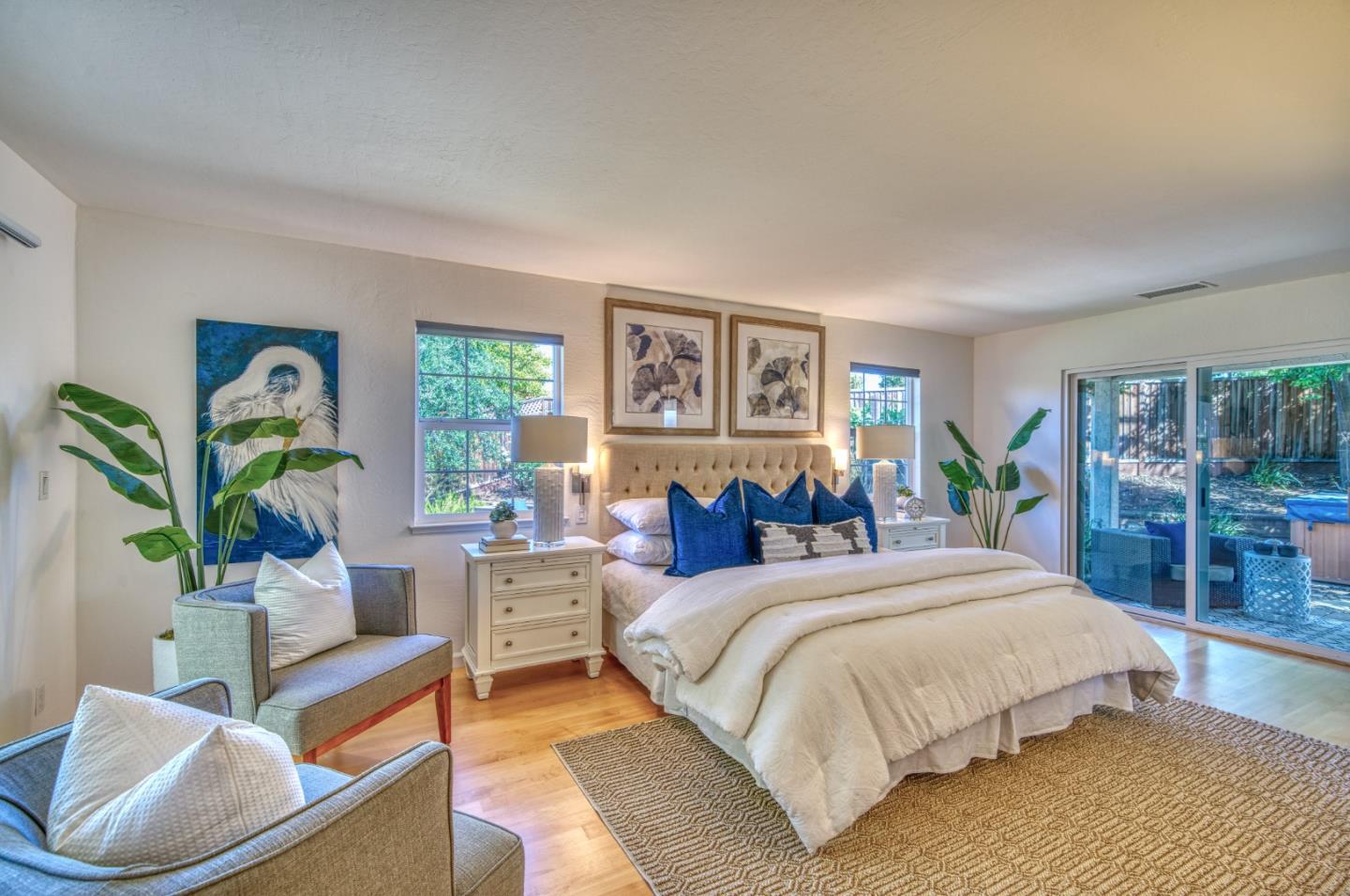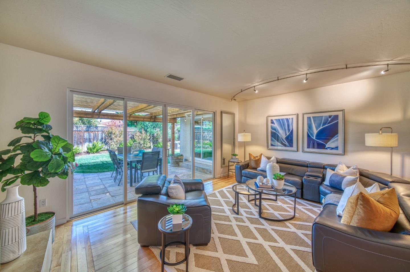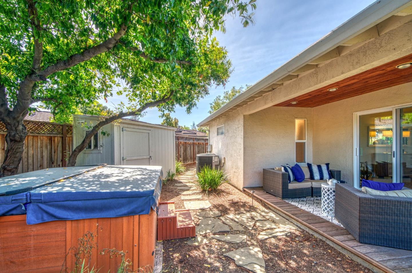 This beautiful 4 bedroom, 2.5 bathroom was designed for comfort and style! A few key features: Hardwood maple floors, in the bedrooms, living, and dining areas, with a newly installed floor in the Primary bedroom. fresh interior paint throughout. Large open living room with Travertine gas fireplace, Nest thermostat, Central Air & Heat. Separe dinine area / Butlers station with granite countertops, cherrywood cabinets, wet bar, with 180 bottle wine refrigerator. Updated chefs kitchen features all stainless steel appliances: double Dacor oven, built-in microwave / Thermador 6 burner gas stove w/ exhaust hood, Viking dishwasher, Viking Refrigerator, large center island with granite counters, extra sink. One bedroom is also perfect for home office. Remodeled Hall bathroom with large shower and double sink vanity. Primary Suite features: new maple floor, walk-in closet, combination wall safe, with access to private covered patio and patio area. Beautifully Landscaped front and back with with Large Trellis over main patio, Great for outdoor entertaining: 3 separate patio areas / gas firepit, lush greenery with lemon, olive trees, grapevines, and a raised vegetable garden. Owned Solar Panels 6.3 KW. Dual Pane Windows / Tuff Shed /