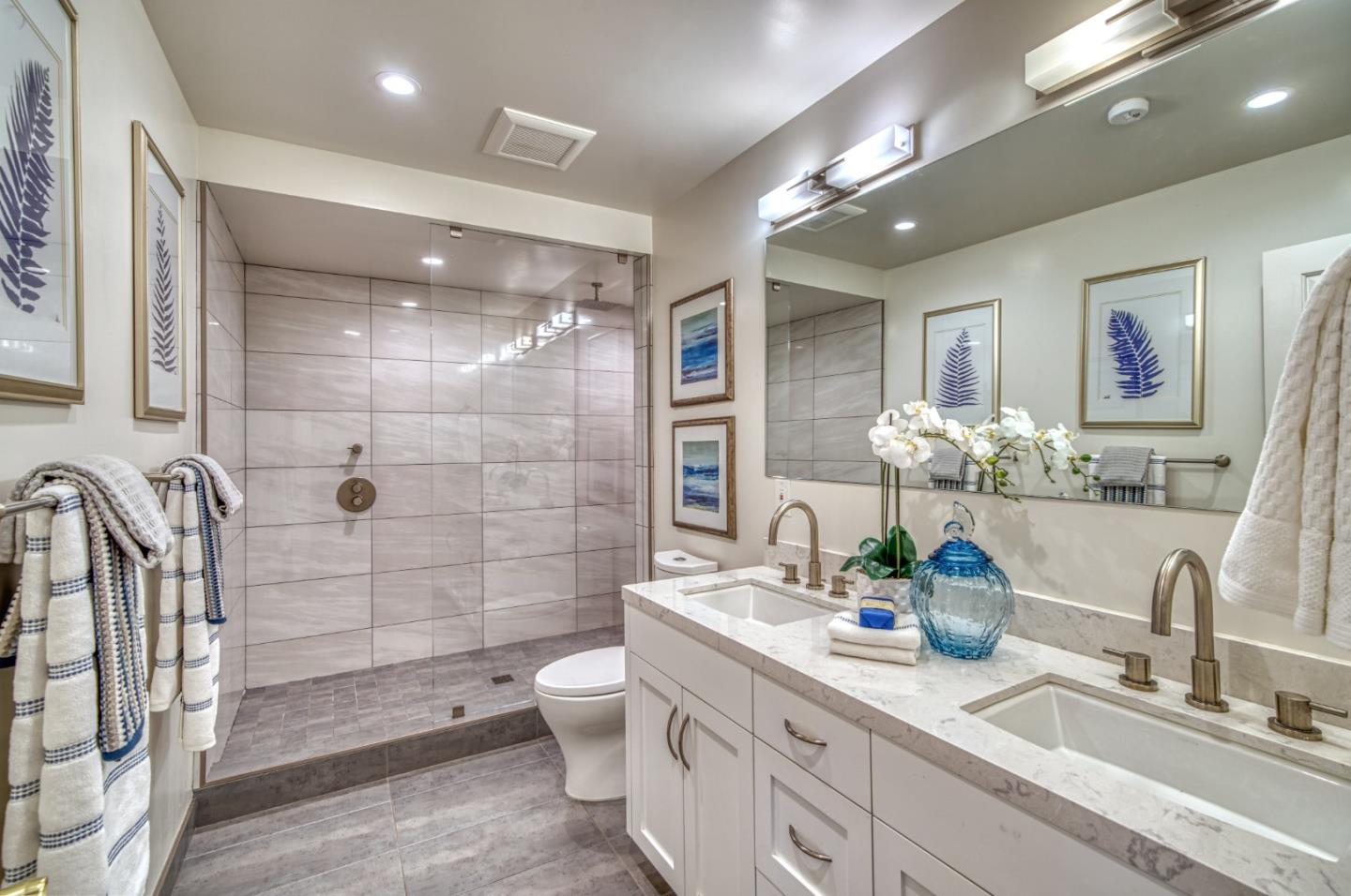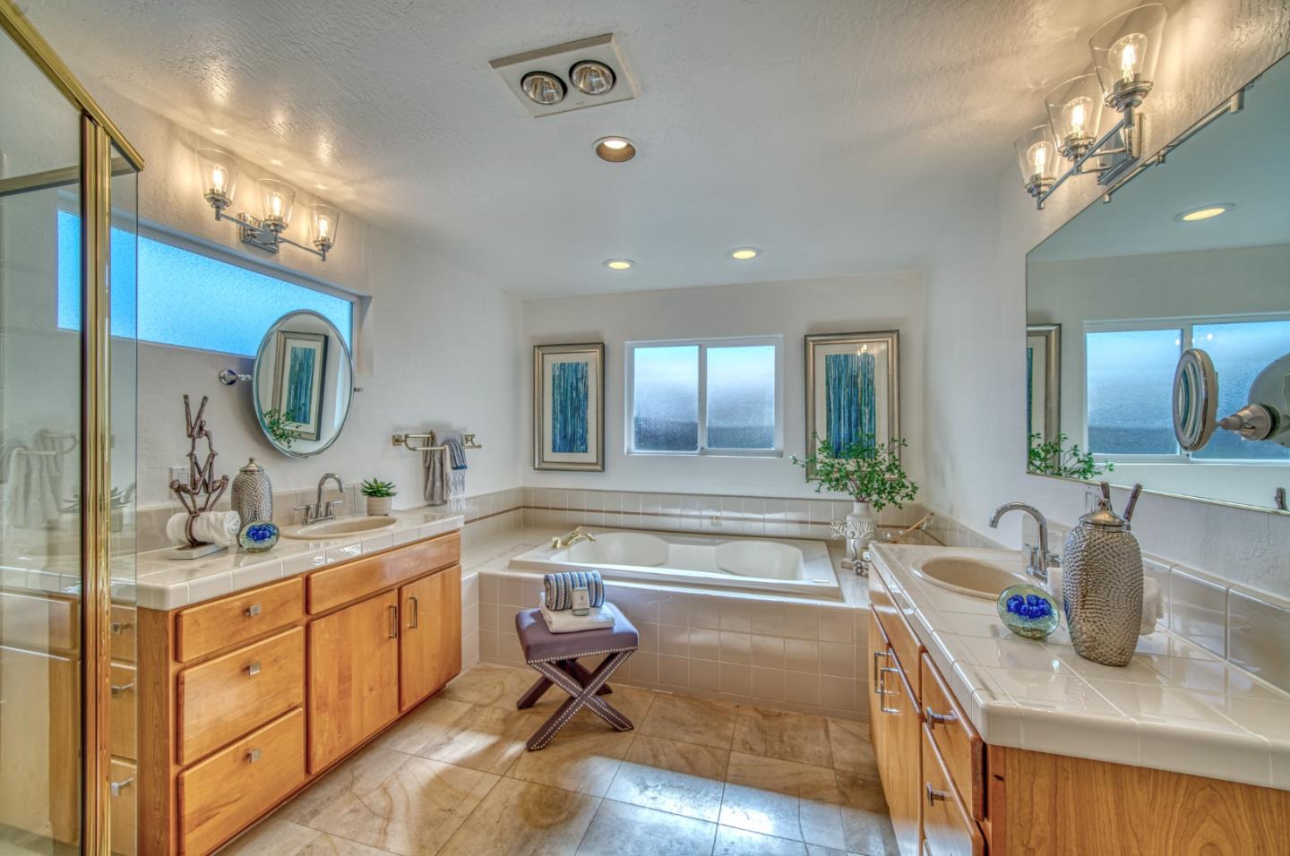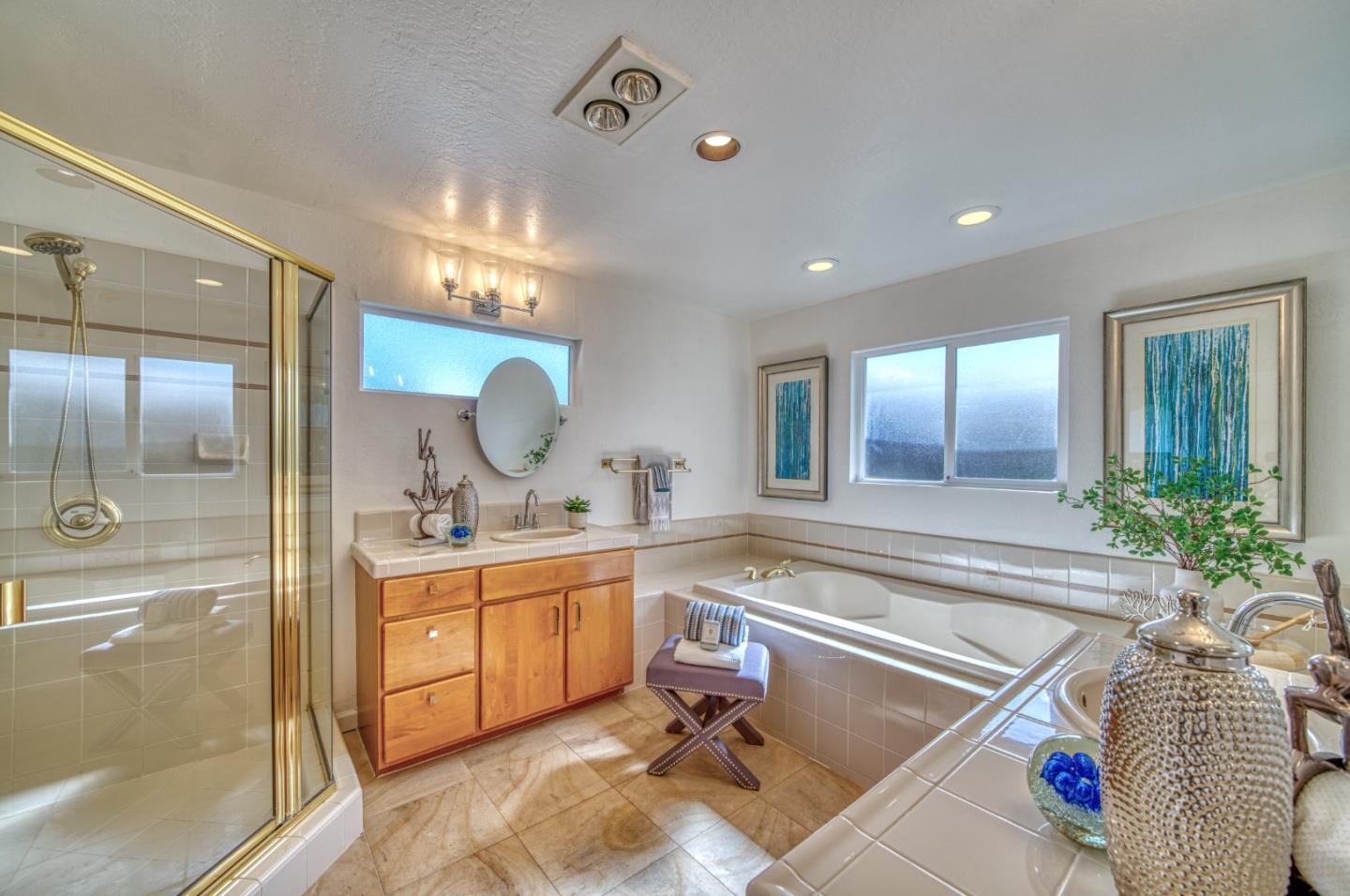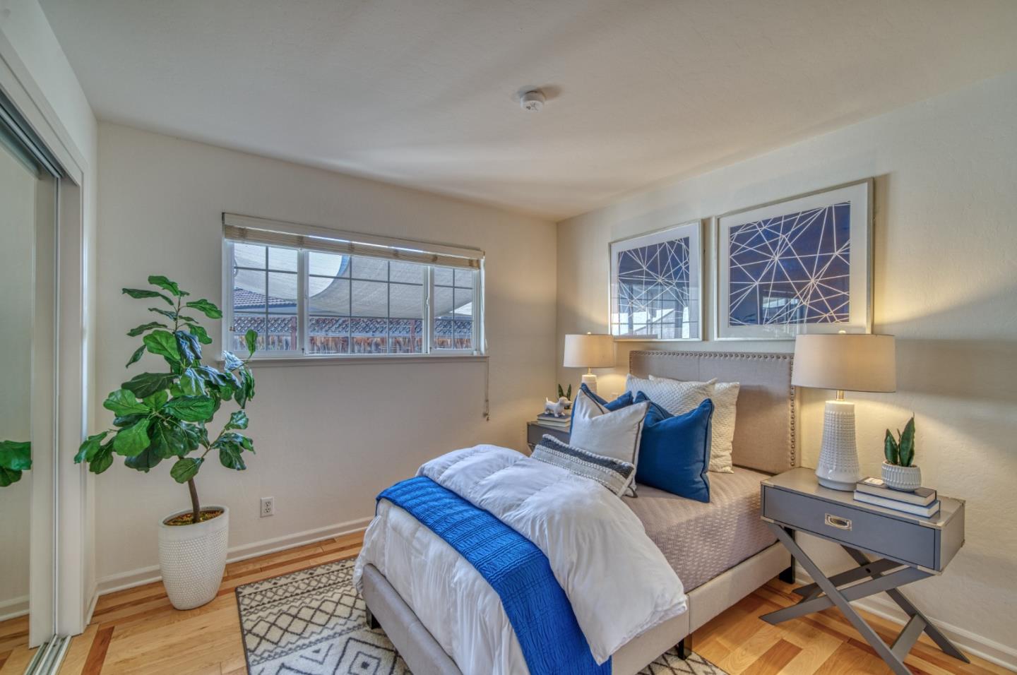 This beautiful 4 bedroom, 2.5 bathroom was designed for comfort and style! A few key features: Hardwood maple floors, in the bedrooms, living, and dining areas, with a newly installed floor in the Primary bedroom. fresh interior paint throughout. Large open living room with Travertine gas fireplace, Nest thermostat, Central Air & Heat. Separe dinine area / Butlers station with granite countertops, cherrywood cabinets, wet bar, with 180 bottle wine refrigerator. Updated chefs kitchen features all stainless steel appliances: double Dacor oven, built-in microwave / Thermador 6 burner gas stove w/ exhaust hood, Viking dishwasher, Viking Refrigerator, large center island with granite counters, extra sink. One bedroom is also perfect for home office. Remodeled Hall bathroom with large shower and double sink vanity. Primary Suite features: new maple floor, walk-in closet, combination wall safe, with access to private covered patio and patio area. Beautifully Landscaped front and back with with Large Trellis over main patio, Great for outdoor entertaining: 3 separate patio areas / gas firepit, lush greenery with lemon, olive trees, grapevines, and a raised vegetable garden. Owned Solar Panels 6.3 KW. Dual Pane Windows / Tuff Shed /