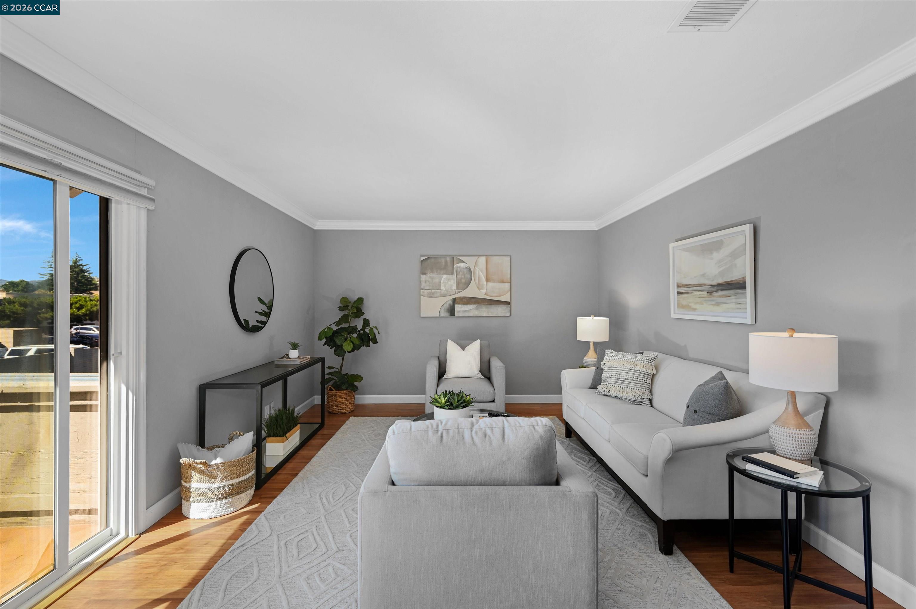 Bright and airy upper-level 2-bedroom, 1-bath condo ideally located in Concord near the Walnut Creek border, offering scenic Mt. Diablo views. Enjoy morning coffee or sunset skies from your private balcony. The open and functional floor plan features an updated kitchen, spacious living and dining areas with laminate flooring, and elegant crown and baseboard molding throughout. Designed for easy everyday living, this home is ideal for first-time buyers, downsizers, or commuters. Conveniently close to shopping, dining, BART, medical offices, and major commute routes. Includes covered parking, abundant guest parking, and access to the community pool.